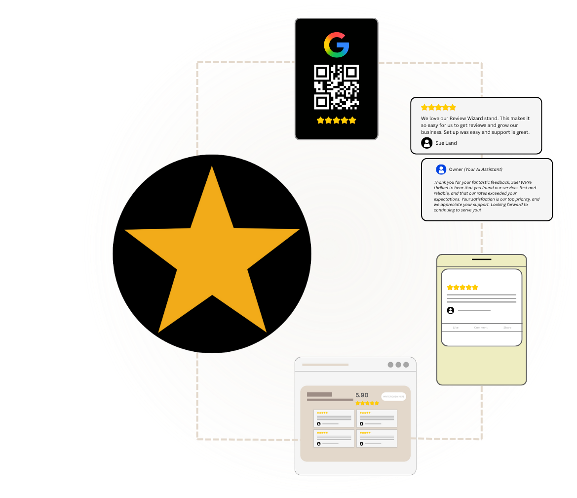 Other than using the Review Wizard AI System cards to get reviews, the system is literally hands free. We'll ensure that we get all the proper business info and connections to set up your custom AI-powered system.